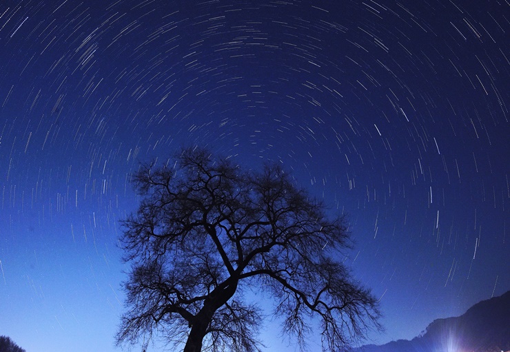 캄캄하고 맑은 어느 날 밤느릅나무 별 궤적을 연출해 보았다