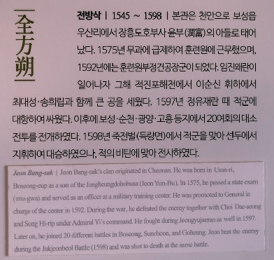 보성 역사문화관 안으로 들어가면 보성의 역사인물 전방삭 장군의 행적 판을 한글과 영문으로 기록하여 전시하고 있다.