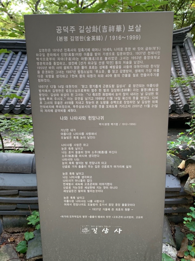 시주 ‘길상화 보살’의 공덕비 앞에 서서 그분의 영혼을 느껴보고, 법정 스님과 두 분의 합작으로 이루어진 무소유 도량의 분위기를 가슴에 담았다. 산의 정기를 담고 있는 도인 법정 스님의 책 ‘무소유’를 읽고 감동한 여성 김영한이 파란만장한 인생을 거치며 이루어 놓은 막대한 재산. 성북구에 잘 개발된 7천여 평의 대지와 40여동의 건축물을 기부하면서 만들어졌다는 길상사. 숲 냄새, 사람 냄새 풍기는 두 분과 더불어 김영한의 이루지 못한 사랑 백석 시인의 삶과 숨결은 잘 삭은 식혜와 같은 정감을 불러일으킨다. 세상을 맑고 향기롭게 하는 한국의 최고의 영적 유산이다.