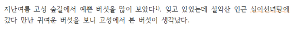 '지난여름 고성 숲길에서 예쁜 버섯을 많이 보았다. 잊고 있었는데 설악산 인근 십이선녀탕에 갔다 만난 귀여운 버섯을 보니 고성에서 본 버섯이 생각났다.'