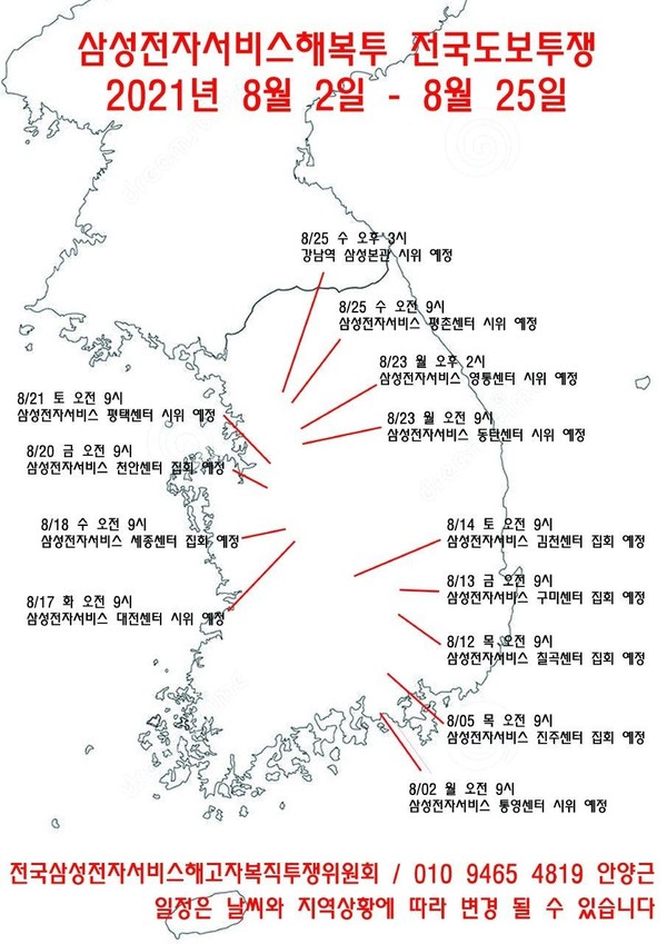 9:00 삼성전자써비스해복투 전국순회도보투쟁/ 이재용 사면, 가석방 반대! 삼성 피해자 문제해결 /삼성전자서비스 영통 센터