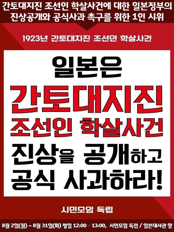 *간토대지진 조선인 학살사건에 대한 일본 정부의 진상공개와 공식사과 촉구를 위한 1인시위 8.2~8.31시민모임 독립 / 일본대사관 앞