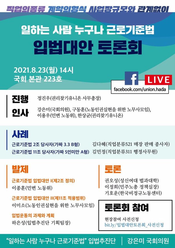 오후2:00 권리찾기유니온/“일하는 사람 누구나 근로기준법" 입법대안 토론회/국회본관 223호