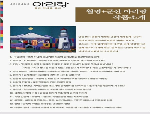 군산에는 일제강점기, 일제가 군산지방을 수탈하려 사용한 근대 역사 유적지들이 있다. 중학교때부터 이곳에 자주 스케치 하러 갔다. 월명-군산아리랑'은 이 근대 역사 유적지들의 이미지들을 꼴라쥬 형식으로 표현했다. 가혹했던 상처를 품은 월명산에 달이 뜨는 희망의 메세지를 형상화한 작품이다. 군산근대미술관 초대전 출품작이다.