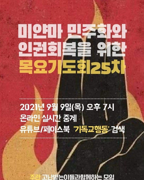 오후7:00 미얀마 민주화와 인권회복을 위한 목요기도회 25차 / 유튜브•페이스북 '기독교행동'