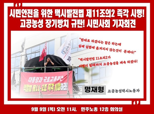 11:00 시민안전을 위한 택시발전법 제11조의2 즉각 시행! 고공농성 장기방치 규탄! 시민사회 기자회견 / 민주노총 12층 회의실
