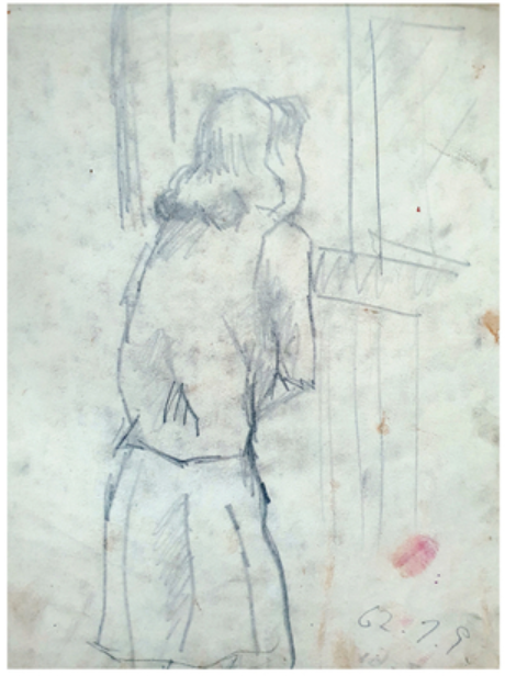 늘 별로 말없이 만화가게를 보거나 빵을 굽거나 방에서 쉬시던 아버지는 내가 그림 그리는 일에 크게 관심이 없는 줄 알았다. 그러던 어느 날 스케치북을 하나 주시는 것이었다. 그것도 당신이 종이를 구하여 거기 출석표 표지 같은 것으로 직접 칠을 한 것으로. 나는 놀랍고도 기뻐 당장 그림을 그리기 시작했다. 첫 그림이 이거다. 어디선가 본 그림인지 사진인지는 모르겠으나 왠지 많은 여운을 주며 생각하는 장면이었다. '생각하게 하는 그림'은 이렇게 시작되었다. 그러나 이어지진 못했다. 어떻든 미술반 활동과 아버지의 스케치북으로 4학년 나는 그림의 중흥기를 맞게 되었다.