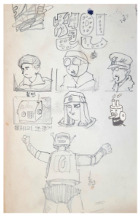 이 시기엔 '철인 28로' 탓인지 로봇보다 인조인간이나 철인이라는 말을 많이 쓴 것 같다. 그 때는 물론 철인 28호가 당연히 한국 만화인 줄 알았던 때다. 나도 한 번 철인 만화를 그려볼까 하고 초안을 잡아봤다. 주인공 철민이와 문제의 조종기, 악당은 라이파이에서 등장하는 의상과 비슷하다. 그러나 스토리로 이어지지는 못했다. 이후 잊을 수 없는 로봇 만화는 공장 굴뚝 안에 살면서 어려운 아이들을 도와주는 이웃집 아저씨 같은 '삐삐' 로봇 만화다. 정겨운 로봇이었다. 김경언 선생의 작품으로 기억한다.
