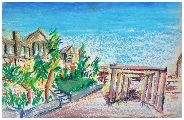 외삼촌의 지도로 내 그림에 약간의 변화가 왔다. 손으로 문지르는 방법은 별로 재미를 보지 못해 그만두었다. 검은색을 쓰는 것은 위 그림에서처럼 이어졌다. 학교 운동장에서 남자 아이들은 축구를 하고 여자 아이들은 고무줄 놀이를 많이 했다. 남자 아이들이 고무줄 끊고 도망가는 사건이 속출했다. 한 번은 축구공에 내가 머리를 맞아 땅바닥에 쓰러졌다. 잠시 정신을 잃었다가 눈을 뜨니 아이들의 발이 보였다. 나는 산수를 하기 시작했다. 3 더하기 5는 8, 4 곱하기 7은 28. 이상이 없구나(4학년 그림)