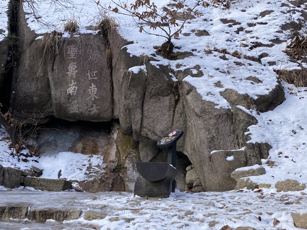 샘까지 가려면 서너 번 엉덩방아를 찧어야 할 정도로 가파른 바위를 서너 걸음은 기어올라야 하거든. 우선 ‘만세동방 성수남극(萬世東方 聖壽南極)’이라는 구절이 보여. 누가 언제 새겼는지 모른다고 하나, 이승만 전 대통령이 이 물을 즐겨 마셨다고 하잖아? 필시 그즈음에 어떤 맹목적 충성파들이 복채 듬뿍 들고 무슨 법사 찾아가서 받아온 구절 새겨놓고, 만백성 누구도 얼씬거리지 못하게 닦달하고 잡도리하기에 여념이 없었을걸. 그러면서 물 한 방울 새지 않게 24시간 지켜 서서 떠다 바쳤을 거야.