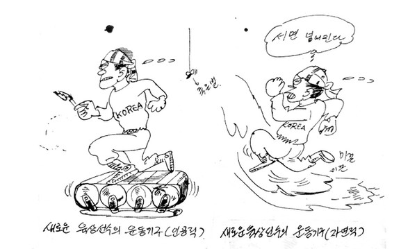잡지들에 실린 만화를 많이 봐서 그런지 나는 유머 만화를 즐겨 그렸다. 어느 날 엿장수의 엿 파는 흉내를 아이들에게 했더니 순식간에 인기 개그맨이 되어 김재준 국어 선생님은 아예 수업시간에서 10분을 할애하여 개그 강의(?)를 하라고 하였고 코미디언에게 소개해 주겠다고 까지 했다. 나는 집에서 웃기는 이야기를 직접 만들어서 강의해야 하는 상황이 되었다. 이후 학교 공인 대표 개그맨이 되었다. 이 그림도 그때 그린 유머 만화인데 놀라운 것은 내가 그때 있지도 않은 러닝머신을 만들어 그린 것이었다. (중1 그림)