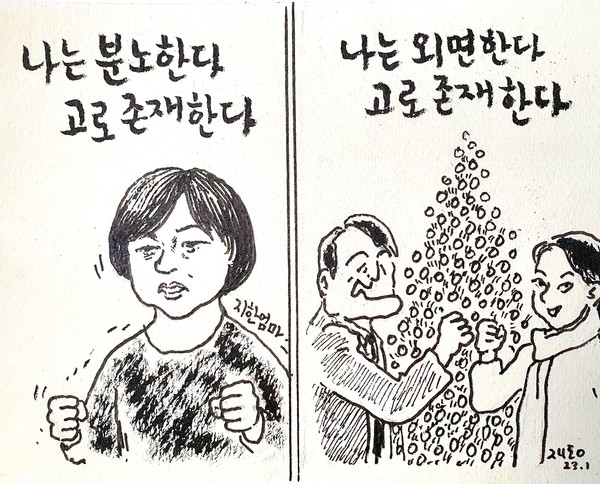 편집 : 김미경 편집위원 박재동 주주 tangripark@hanmail.net 한겨레신문 주주 되기 한겨레:온 필진 되기 한겨레:온에 기사 올리는 요령 관련기사 박재동 그림 기사더보기 [박재동 그림] 김혜경 여사 캐리커쳐 [박재동 시사만평] [박재동 시사만평] [박재동 그림] 우리는 촛불이니까 [박재동 시사만평] 관련기사 전체보기 키워드 #박재동 박재동 주주 tangripark@hanmail.net 다른기사 보기 저작권자 © 한겨레:온 무단전재 및 재배포 금지 당신이 봐도 좋은 기사 [최자영의 금요칼럼](112) 헌법재판소도 대법원 같을 것이라 지레 재판소원 제도가 불필요하다는 임재성(변호사)의 조희대론(論) 간호윤의 실학으로 읽은 오늘 지하철역 풍경 (3) [김반아 칼럼] K-스탠다드: 한국 인성 표준(K-Humanity Standard) 설립 제안 [ 시 ] 주님, 가을에는 [ 시 ] 떨어져야 산다 [김종구 특별기고] 검찰 '선택적 집단행동'의 본질 [최자영의 금요칼럼](112) 헌법재판소도 대법원 같을 것이라 지레 재판소원 제도가 불필요하다는 임재성(변호사)의 조희대론(論) 댓글삭제 삭제한 댓글은 다시 복구할 수 없습니다. 그래도 삭제하시겠습니까? 비밀번호 닫기 기사 댓글 1 댓글 접기 로그인 후 이용 가능합니다. 댓글 내용입력 비회원 로그인 이름 비밀번호 댓글 내용입력 댓글쓰기 계정을 선택하시면 로그인·계정인증을 통해 댓글을 남기실 수 있습니다. 회원 로그인 비회원 글쓰기 이름 비밀번호 자동등록방지 로그인 옵션 창닫기 댓글목록 최신순 추천순 욕설, 타인비방 등의 게시물은 예고 없이 삭제 될 수 있습니다. 박서호 2023-01-15 02:02:04 더보기 삭제하기 외면함으로 존재한다고 힘주어 말했다가 곧 외면당하여 죽습니다. 2023년 1월 15일 (일) 주요기사 가을 이야기 1959년 기해년 <진주형씨족보: 판서공파보> 발문 1 한겨레 본사의 ‘한겨레:온’ 필진으로부터의 의견 청취 누락 유감 [박재동 시사만평] 저눔의 당골네 깃발 [박재동 시사만평] '한겨레 온' 송년 특집: 무엇이 한국의 기적을 만들었나?(예고) 회한의 눈물 ‘여순사건 포고령 위반' 재심서 11명 무죄 선고…“유족들 고통에 위로” 1959년 기해년 <진주형씨족보: 판서공파보> 기(記) 3 1959년 기해년 <진주형씨족보: 판서공파보> 기(記) 2 제주에서 1주일 - 성산일출봉 [공문] <한겨레:온> 기사 관련 언론중재위원회 조정 후속조치의 건 [시] 남영호와 사삼학살 내가 하고픈 말 21