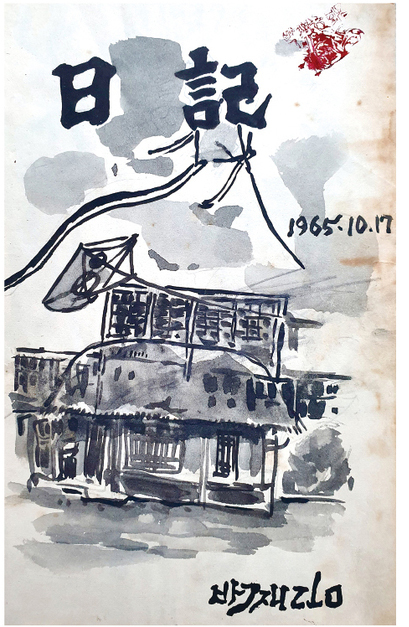 나는 태어나 살던 고향 울산 모래골(서사)를 너무나 사랑하였다. 할배 만들어 놓은 논에 파란 벼 살랑살랑 자라 누렇게 고개 숙이고 산 넘어 남촌에서 바람이 불면 넘실대며 파도치는 보리 물결. 사랑하는 할배, 할매, 엄마, 아부지, 고모, 삼촌, 마을 어른들. 소먹이며 뛰어놀던 동무들. 파란 하늘에 박힌 빨간 감, 그 위로 날아다니던 잠자리, 참새, 종달새, 제비, 뻐꾸기. 몸은 부산에서 중학교를 다녀도 마음은 언제나 고향에 가 있었다. 그래서 나는 일기장을 만들어 첫 장 그림을 이렇게 그렀다. 내가 다니는 학교 건물과 연 날리는 내 고향 초가집을 오버랩시켜서. (중1 그림)