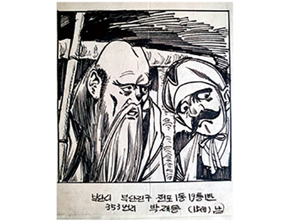 만화는 주로 잉크가 아닌 먹으로 그리는데 동네 문방구 먹은 너무 질이 나빠 푸석 푸석 부서지는 판이었다. 좋은 먹은 너무 비싸 어머니께는 입도 벙긋 못할 지경이었다. 조선방직공장에 다니는 나보다 3살 많은 무출이 고모가 생각났다. 고모 자취방까지 한 시간 넘게 걸었다. -고모야. 만화를 잘 그리려면 먹이 좋아야 되거든... -그래... 얼마 하니? - 백 원 그리곤 아주 잠깐 고민을 정리하고는 -알았다. 그때 버스비가 3원 정도였으니 큰돈이었다. 게다가 시골서 내려와 얼마 안 되는 월급으로 자취하며 돈을 모아야 되니 얼마나 힘들었을까. 위 그림은 그때 그린 그림으로 고우영 선생(당시는 추동성)의 만화 주인공 화동이의 도우미 턱없는 무사 대종과 스승님이다. 독자란에 보내려고 그렸지만 보내지 않았다. (중2 그림)