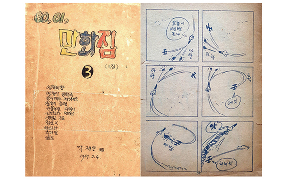 이웃 동네 문현동에는 아주 작은 만화방이 있었다. 여기엔 내가 그토록 사랑하던 1960, 61년 경의 만화들이 가득했다. 모두 우리 집 만화방에서는 사라진 만화들이다. 아! 이 만화방을 통째로 사서 두면 얼마나 사랑스럽고 소중한 문화재가 될 것인가! 그러나 내겐 돈이 없구나! 너무나 답답한 나는 꾀를 내었다. 만화책을 빌려 와서 표시가 안 날 만큼 떼내어 모음집을 만든 것이다. 결국 주인이 알고 눈치를 주어 그만두었다. (그 정도로 그쳐 준 주인 아저씨께 지금도 감사한다) 그리고 내가 모은 만화 중의 '칠성이' 시리즈는 김경언 선생이 쓱싹쓱싹 그려 치우는데 하루에 한 권을 그린다고 한다. 어떻든 우리는 쏙 빨려 들어갔기 때문에 나도 참고로 하고 있다. 하루에 한 권 그리는 만화라~~~!