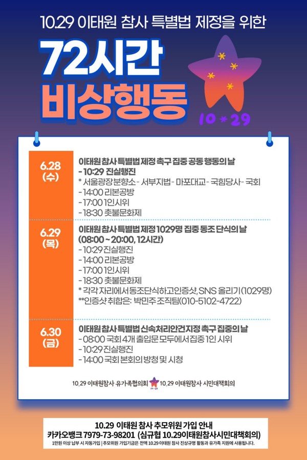 6월 30일 임시국회 본회의를 앞두고 유가족들과 야4당 국회의원들, 종교계, 시민대책회 소속단체 등 총 집중하는 공동행동, 10.29 진실 행진을 진행하고자 합니다. 행진 종료 후, 72시간 비상행동에 들어갑니다.