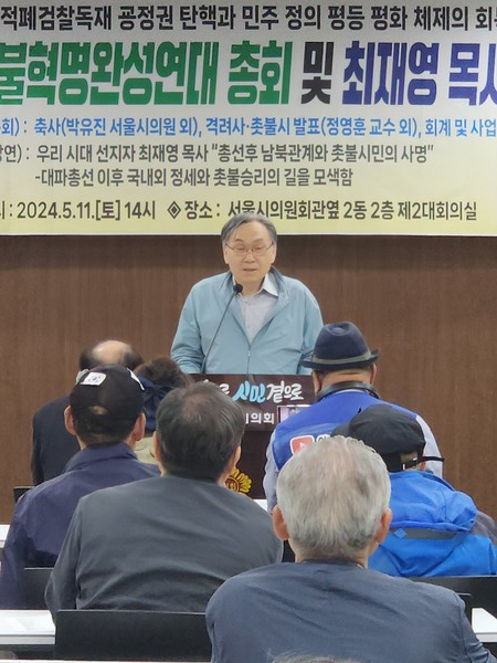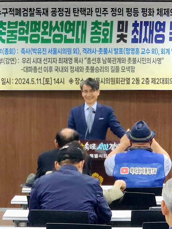 촛불혁명완성연대 6회 총회 및 최재영 목사 강연회가 5.11.토. 오후 2시~5시, 서울시의원회관(정확히는 서울시의회 별관 2동) 제2대회의실에서 있었다.