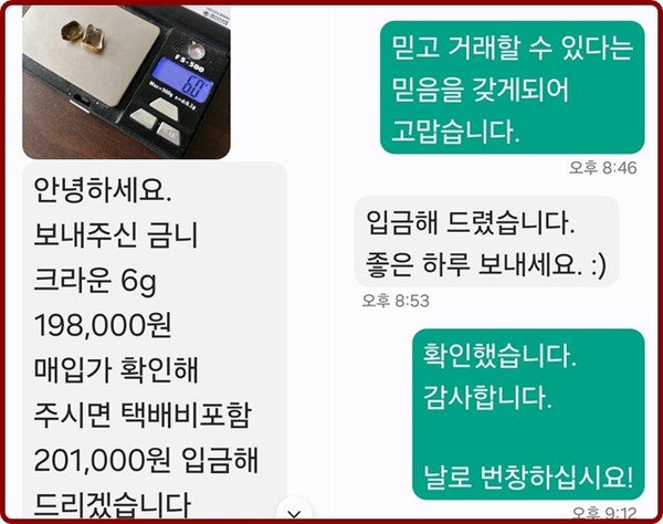 한 줌 권력과 술에 취해 불신과 몰상식 그리고 사기만 판치는 대한민국에서 이미 내손을 떠난 금붙이가 꽃이 되어 제 마음을 따뜻하게 합니다. 작은 의심과 불안이 못나게 느껴져 바로 고맙다고 답장을 보냈고, 몇 분 후에 입금했다는 연락을 받았습니다.