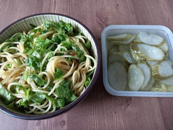 파스타를 좋아하는 분들은 알겠지만 토마토파스타로 시작을 해서 크림파스타로 갔다가 알리오 올리오 파스타를 찾게 됩니다. 알리오 올리오는 매력적이지만 느끼하다는 단점이 있습니다. 그걸 극복하려고 상추와 치커리를 채 썰어서 용기 바닥에 깔았습니다. 그리고 알리오 올리오 파스타를 올려서 섞어 먹었습니다.