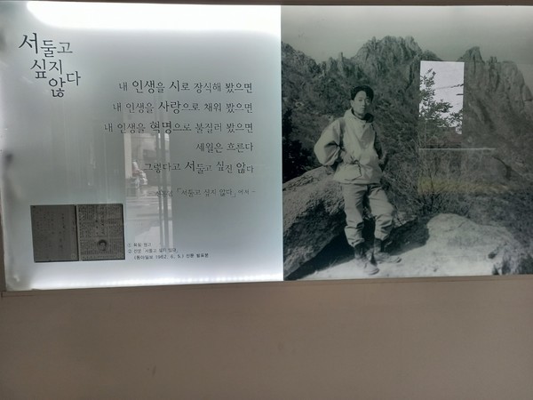 대부분이 아는 것 같지만 실제로는 잘 알지 못하는 작가들이 많습니다. 신동엽하면 '껍데기는 가라'를 쓴 시인인 줄은 알지만 젊은날에 울분을 토하면서 떠들었을 뿐 그에 대해서 아는 게 별로 없지요. 나도 매한가지입니다. 문학관에 와서야 신동엽 시인이 동학농민군의 자취를 따라서 걸었고, 해월 최시형 선생님을 흠모했으며 클라이머였다는 사실도 알았습니다.