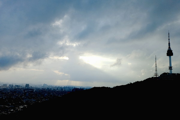 억수 빗님을 피해 차 한잔하고 남쪽 둘레길로 내려가는데 전망대에서 멋진 남쪽 하늘이 또 저흴 반겨줍니다. 햇님이 빗님에 뒤질세라 구름 사이로 햇살을 뿌려줍니다. 빗님에 깔끔하게 씻긴 온갖 구조물들도 이때다 싶어 자랑하듯 제 모습을 맘껏 드러냅니다. 비 온 뒤 남산은 참으로 상쾌합니다.
