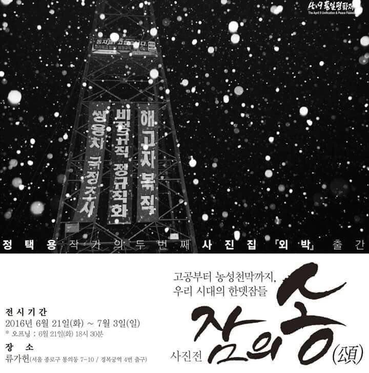 * 정택용 작가의 두번째 사진집 '외박' 출간 사진전 (6/21~7/3) 고공부터 농성천막까지 우리 시대의 한뎃잠들 '잠의 송'/류가헌 (경복궁역 4번출구)