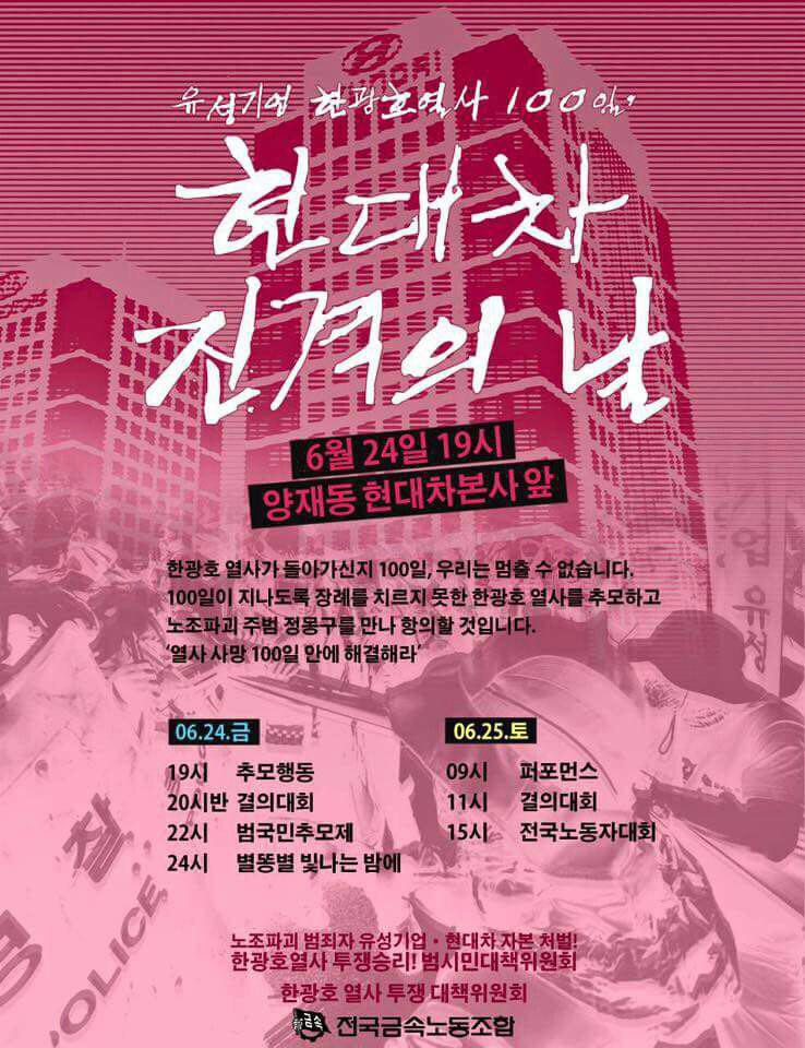 오후7:00 현대차 진격의 날/한광호 범국민추모제/양재동 현대차 본사 앞