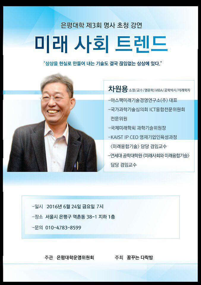 오후7:00 은평대학 명사초청강연회/ 미래사회 트렌드 (차원용교수)/ 꿈꾸는 다락방(역촌동 38-1)