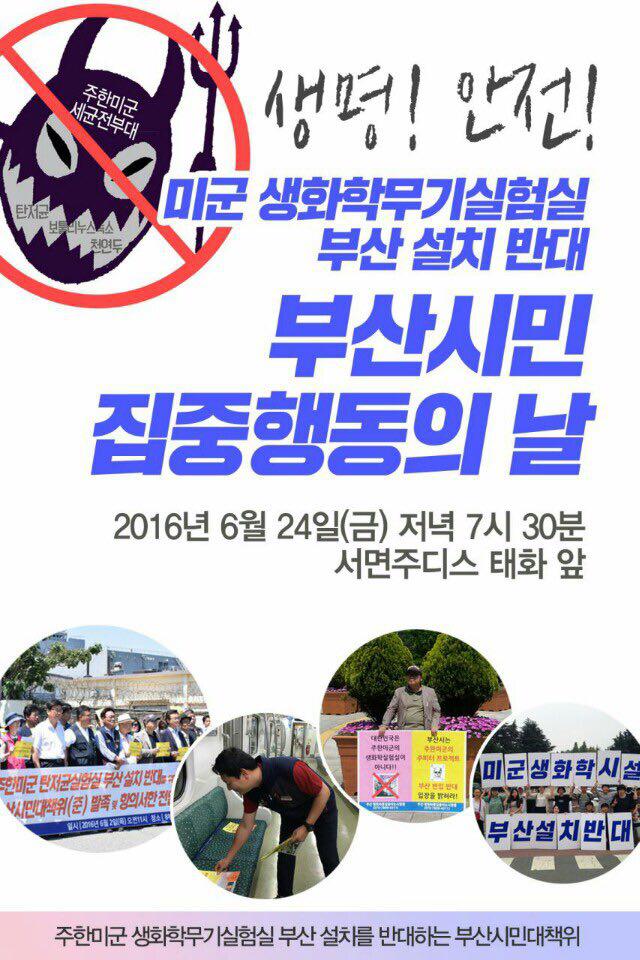 오후7:30 부산시민 집중행동의 날/미군 생화학무기 실험실 부산 설치 반대/서면 주디스 앞