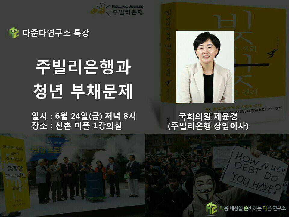 오후8:00 다준다연구소 특강/주빌리은행과 청년부태문제(제윤경 의원)/신촌 미플 1강의실