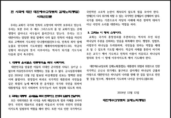 대한예수교장로회(통합) 김제노회 목사 장로 "尹"즉각 탄핵 시국선언