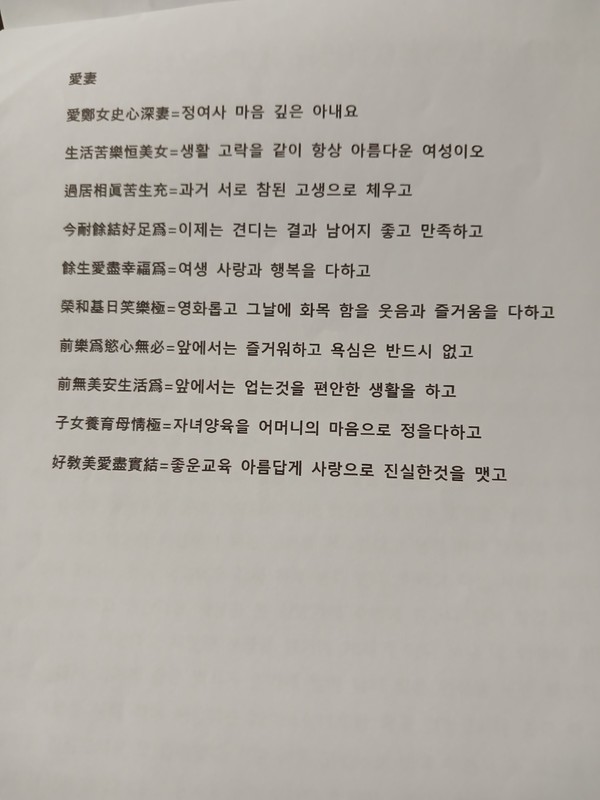 요즈음 자식 위해서 손주 돌보는 것도 만만치 않음에도 마다 않고 열과 성을 다해서 돌봐줘서 고마워요. 후일에 고맙다는 말이나 할른지 모르겠오. 훈육은 우리의 세대와 현세대 너무 차이가 있어서 안타까울 뿐이오. 당신 몸 상할까 걱정이오. 몸 건강도 생각 하시오. 나는 당신이 있어야 되고 당신이 필요합니다. 감사하고 또 감사합니다.