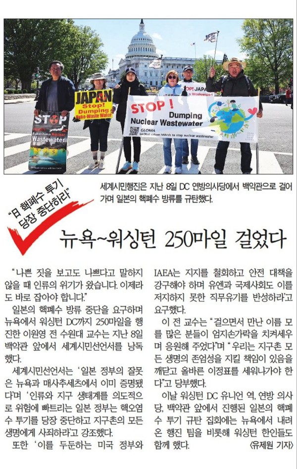 일본의 핵폐수 방류를 규탄하고 중단을 요구하는 반핵운동가 이원영 (전)교수+美동부 한인들+시민들이 3월 19일~4월 8일 뉴욕 유엔본부에서 워싱턴DC 백악관까지 장장 416 Km(약 250마일)를 도보행진 하며 일본의 만행을 전세계에 고발한 '핵폐수투기STOP세계시민행진(GLOMA MARCH)이 8일 오후 2시 목표지점인 워싱턴DC 유니온 기차역, 2시30분 의사당, 4시 백악관 앞에 도착하여 성명을 발표함으로써 장장 21일간의 대장정의 막을 내렸다. [관련기사 뉴욕일보 2월 26일자 1면, 3월 20일자 1면-'"日핵폐수 방류 중단하라" 3월 19일~4월 8일 뉴욕~워싱턴DC 250마일 도보 행진' 제하 기사 참조] [뉴욕일보] "日핵폐수 방류 중단하라" 뉴욕~워싱턴DC 250마일 도보 헹진 "첫발"