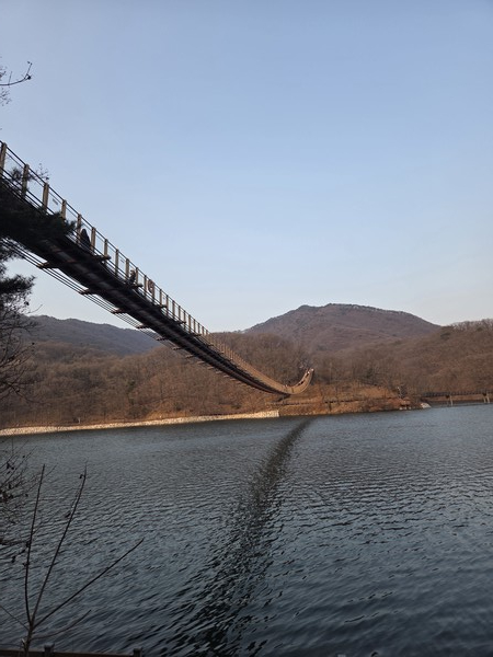 출렁다리 아래 무너진 축대는 아직 공사 중이었고, 호수 주위 산자락에는 연두빛이 보이지 않았다. 그럼에도 헐벗은 산색은 점차 파스텔톤으로 변해가고 있었다.