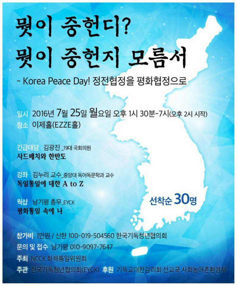 오후1:30 한국기독청년협의회 긴급토론회/'정전협정을 평화협정으로'/기독교회관 이제홀