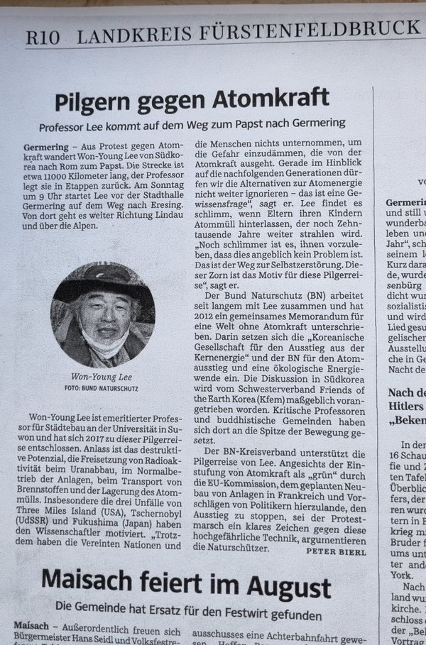 지난달 26일경 뮌헨 근교를 지나면서 그 지역의 언론에서 게재한 필자의 인터뷰 기사를 최근 지인이 번역해주셨다. 그중 주요내용을 발췌하여 정리하면, 이교수는 "3번의 큰 원전사고에도 불구하고 국제연합 등은 아무 일도 하지 않았다. 수 만 년간 계속 방출되는 방사성폐기물을 부모가 자녀에게 물려주는 것은 불행이다. 더 불행한 일은 자녀에게 나쁜짓을 저질러도 되는 것처럼 본보기를 보이는 것이다. 그것은 바로 자기파괴의 길이다. 인류가 이래서야 되겠는가. 이것이 순례를 시작한 출발점이다”라고 말한다.