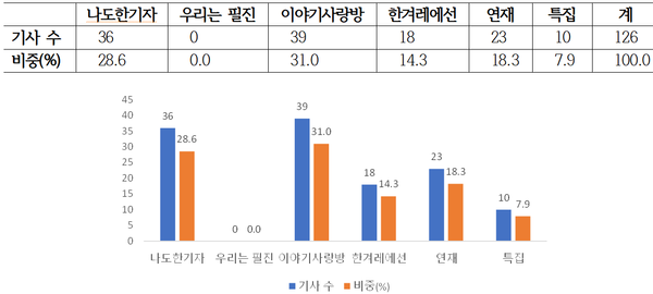 <우리는 필진이다> 기사는 한 건도 올라오지 않았다. 지난달 그 기사는 4건이었다. 한편, 대체로 <이야기 사랑방> 기사가 39건으로 가장 많고 지난달 27건보다 12건 더 많다. <나도 한기자> 기사는 36건으로 지난달 39건보다 3건 적다. <연재> 기사 23건은 지난달 18건보다 5건 더 많다. <한겨레에선> 18건은 지난달 20건보다 2건 적다. <특집> 기사 10건은 지난달 2건보다 8건 더 많다.