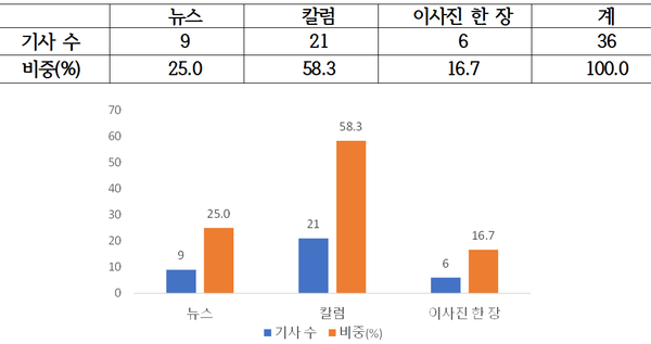 1) <나도 한기자> 기사는 36건으로 지난달 39건보다 3건 줄었다. 작은줄기 <칼럼> 21건은 지난달 27건보다 6건 적고 그 비중은 58.3%에 이른다. <뉴스> 9건은 지난달 9건과 같다. <이사진 한 장> 6건은 지난달 3건보다 3건 많다.