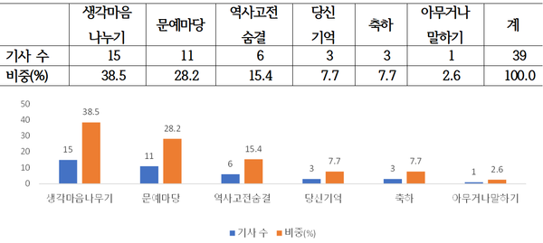 3) <이야기 사랑방> 기사는 39건으로 지난달 27건보다 12건 많다. 작은줄기 <생각과 마음 나누기> 기사 15건은 지난달 12건보다 3건 많다. <문예마당> 기사는 11건으로 지난달 8건보다 3건 늘었다. <역사와 고전의 숨결>은 6건으로 지난달 4건보다 2건 많다. <당신을 기억합니다>와 <축하합니다> 기사는 각각 3건이고, <아무거나 말하기> 기사는 1건이다.