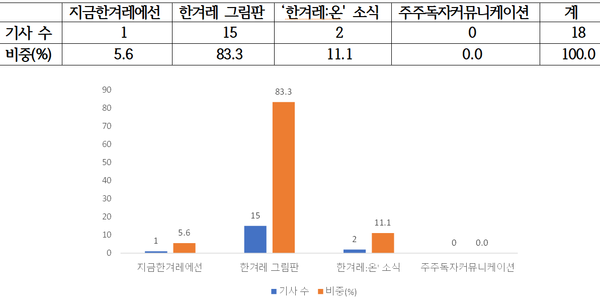 4) <한겨레에선> 기사는 18건으로 지난달 20건보다 2건 적다. 작은줄기 <한겨레 그림판> 기사 15건은 지난달 17건보다 2건 적다. <‘한겨레:온’ 소식>과 <지금 한겨레에선> 기사는 각각 2건과 1건이다. <주주독자커뮤니케이션>의 기사는 지난해 4월 이후 올해 7월까지 올라오지 않았다.