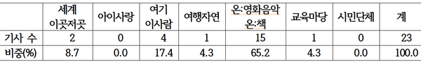 5) <연재> 기사는 23건으로 지난달 18건보다 5건 많다. 작은줄기 <온:영화음악 온:책> 기사 15건은 지난달 3건보다 12건 많다. <여기 이 사람> 기사는 4건으로 지난달 7건보다 3건 적다. <세계 이곳저곳> 기사는 2건이고, <여행속으로 자연속으로>와 <우리교육마당> 기사는 각각 1건이다. <아이를 사랑한다면>과 <시민단체 이야기> 등의 기사는 올라오지 않았다.