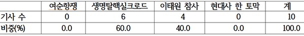6) <특집> 기사는 10건으로 지난달 2건보다 8건 많다. 작은줄기 <이원영의 생명탈핵실크로드>와 <10.29 이태원 참사> 기사는 각각 6건과 4건이다.