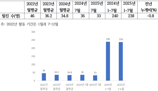 2025년 7월 활동 필진 33명은 전년 동월 36명보다 3명 적다. 활동 필진은 전년 누계비로 0.8% 감소하였다. 즉, 올해 1~7월 누적 활동필진 238명은 전년 동기간 240명 대비 0.8% 적은 수준이다. 전년 누계비는 특정 기간을 전년 같은 시기와 비교한 수치다.