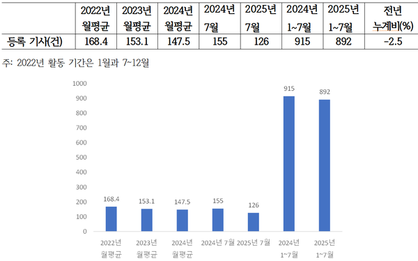 2025년 7월 등록 기사 126건은 전년 동월 155건보다 29건 적다. 등록 기사 수는 전년 누계비로 2.5% 감소하였다. 즉, 올해 1~7월 누적 등록기사 892건은 전년 동기간 915건 대비 2.5% 적은 수준이다.