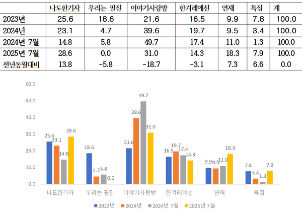 2025년 7월 <나도 한기자>의 비중 28.6%는 전년 동월 14.8%보다 13.8%p, <연재>의 비중 18.3%는 전년 동월 11.0%보다 7.3%p, <특집>의 비중 7.9%는 전년 동월 1.3%보다 6.6%p 각각 높은 수준이다. 한편, <이야기 사랑방>의 비중 31.0%는 전년 동월 49.7%보다 18.7%p, <한겨레에선>의 비중 14.3%는 전년 동월 17.4%보다 3.1%p 각각 낮은 수준이다.