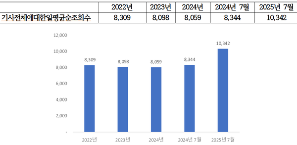 기사 전체에 대한 2025년 7월 일평균 순조회수 1만 342회는 전년 동월 8천344회보다 1천998회 더 많다. 2024년 일평균 8천59회보다 2천283회 많다.