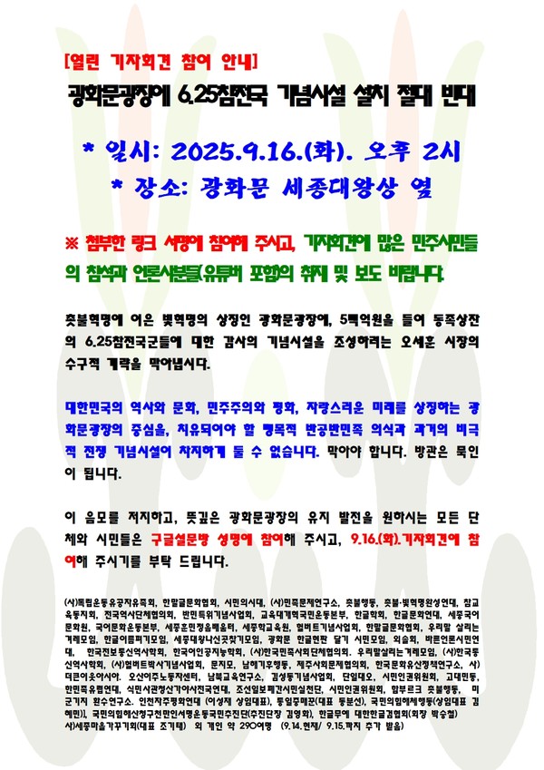 이날 기자회견은 1회성 이벤트가 아니라, 앞으로 광화문광장에 수구적 6.25기념시설 설치를 반드시 저지하고, 광화문광장을 독립투쟁과 위대한 한글, 촛불혁명, 빛혁명의 역사적 민주적 문화적 미래의 중심지로 유지 발전 시키는 곳이 되게 하고자 하는 범시민운동의 시작이라는 점을 명심하여 그것이 취소될 때까지 노력해야겠다.