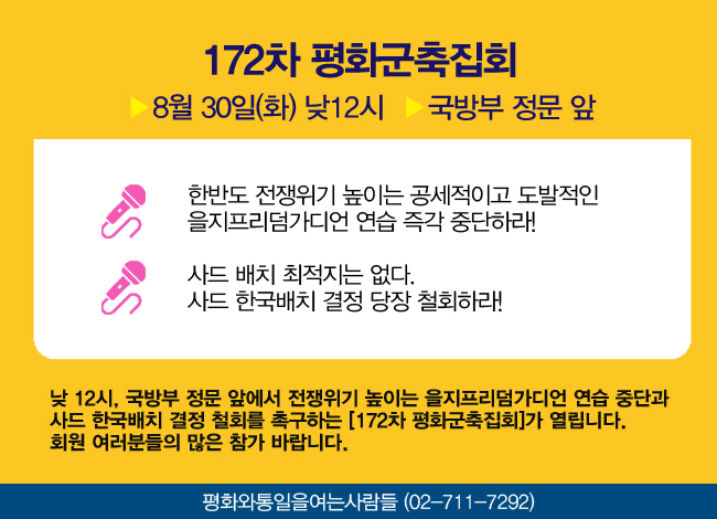12:00 평통사 172차 평화군축집회/사드 제3부지로 주민 분열시켜사드한국배치 관철하려는 국방부 규탄 /국방부 정문 앞