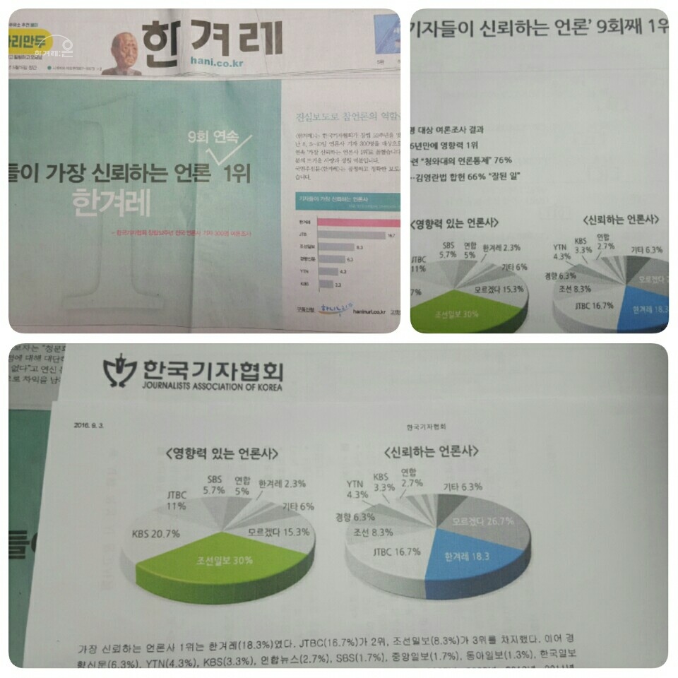 한국기자협회보(2016.08.17.) 의하면, 기자 300명을 대상으로 한 여론조사 결과 <신뢰하는 언론사> 부문에서, 한겨레는 18.3% 비중으로 JTBC(16.7%)보다 앞서고, 8.3%를 차지한 조선일보를 압도하고 있다.
