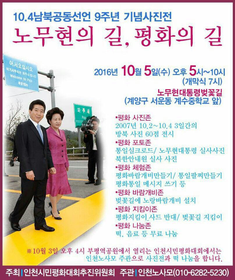 오후5:00~10:00 10.4남북공동선언 9주년 기념사진전/노무현의 길,평화의 길/노무현대통령벚꽃길(계양구 서운동 계수중학교 앞)